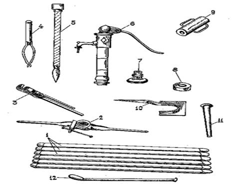 Рис. 1. Мелкий трубчатый колодец: 1 - трубы; 2 - шарнирный хомут; 3 - ключ для труб; 4 - ложковый бур; 5 - водоприемное устройство; 6 - насосная колонка; 7 - забивная головка; 8 - деревянная подкладка; 9 - забивной снаряд; 10 - подкладочная вилка; 11 - игольчатый клапан; 12 - скребок.