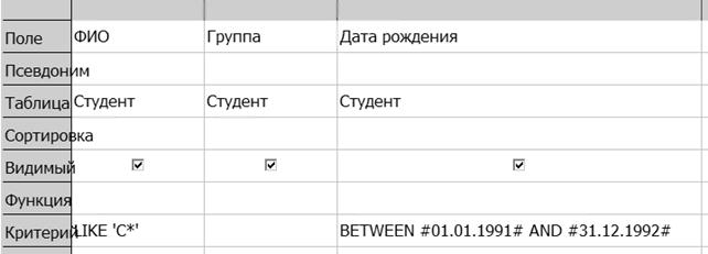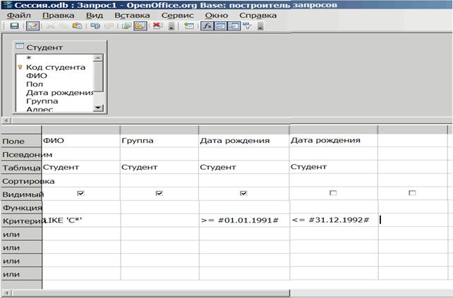 Рассмотрим ряд примеров, поясняющих технологию построения запросов. Пример 1. Создать запрос, формирующий список студентов, фамилии которых начинаются на “C” и родившихся в 1991 – 1992 годах. В результате запроса вывести таблицу, содержащую поля ФИО, Группа, Дата рождения. Условие отбора совпадает с условием поиска в фильтре по умолчанию для аналогичной задачи, рис. 21: ФИО=С* AND Дата рождения >= 01.01.1991 AND Дата рождения <= 31.12.1992. Сравнить задание условия отбора в запросе с условием поиска в фильтре по умолчанию. 1. В главном окне БД Сессия на вкладке Запросы выберите задачу Создать запрос в режиме дизайна. Откроются окна построителя запросов и добавления таблиц, рис. 23. 2. В окне добавления таблицы выберите из списка таблицу Студент и нажмите кнопку «Добавить». Закройте окно добавления таблицы. 3. В таблице Студент дважды щелкните по следующим полям в указанной последовательности: ФИО, Группа, Дата рождения, Дата рождения. 4. Снимите в строке Видимый флажок для последнего поля Дата рождения. 5. Введите в строке Критерий условие отбора. Напомним, что апострофы и символы # подставляются автоматически при нажатии клавиши «Enter» или щелчке по другой ячейке. Результаты проделанных действий представлены на рис. 24.