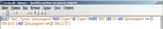 Рис. 26. Условие отбора на языке SQL 9. Просмотреть запрос можно и из главного окна БД Сессия. Дважды щелкните по значку запроса Пример1 и просмотрите ответную таблицу. При изменении или добавлении записей в таблице Студент ответная таблица также будет изменена. Закройте окно Представление данных таблицы. 10. Щелкните правой кнопкой мыши по значку запроса Пример1 и выберите в контекстном меню команду Изменить. Откроется окно построителя запросов, в котором можно произвести необходимые изменения. Рассмотрим другой вариант задания условия отбора для рассматриваемой задачи. 11. Удалите правый столбец Дата рождения, для чего выделите его щелчком по серому полю над заголовком и нажмите клавишу «Delete». 12. Введите новое условие отбора BETWEEN 01.01.1992 AND 31.12.1992. Результаты проделанных действий представлены на рис. 27. 13. Просмотрите запрос, нажав клавишу «F4». Результаты просмотра запроса совпадают с данными рис. 25.
