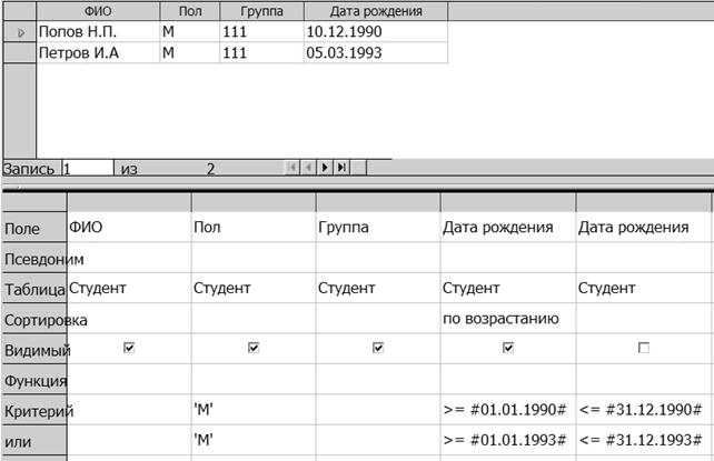 Рис. 28. Условие отбора и результат запроса примера 2