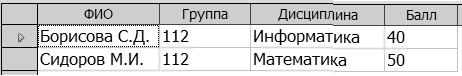 Рис. 33. Результат запроса примера 4 8. Закройте окно построителя запросов и в появившемся окне сохранения запроса задайте ему имя Пример4. 9. В главном окне БД Сессия дважды щелкните по значку запроса Пример4. В появившемся окне Ввод параметра введите название другой дисциплины и номер нужной группы. Просмотрите результат запроса. Закройте окно Представление данных таблицы.