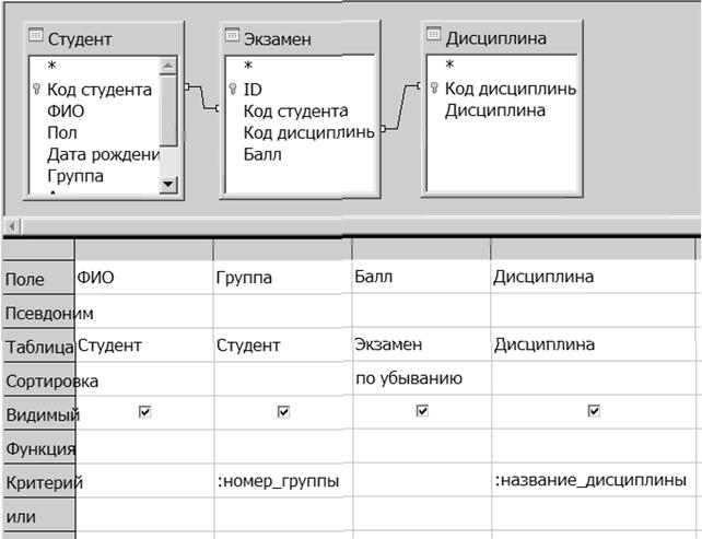 Пример 4. Создайте запрос с параметрами, формирующий сведения о баллах студентов заданной группы по заданной дисциплине. В результате запроса вывести таблицу, содержащие поля ФИО, Группа, Балл, Дисциплина и отсортированную по полю Балл (по убыванию). Условие отбора: Номер группы AND Название дисциплины. Запросы, которые представляют собой варианты базового запроса и незначительно отличаются друг от друга, называются параметрическими. Поля строк Критерий и ИЛИ заполняются не конкретным условием отбора, а обращением к пользователю для ввода параметров условия отбора. Во время выполнения запроса это обращение будет адресовано пользователю, который введет параметры условия отбора. На основании введенных параметров (с учетом других компонент, заданных в строках Критерий и ИЛИ) будет осуществляться отбор записей. Обращение необходимо начинать с двоеточия, например :номер_группы. 1. В главном окне БД Сессия на вкладке Запросы выберите задачу Создать запрос в режиме дизайна. Откроются окна построителя запросов и добавления таблиц, рис. 23. 2. Данный запрос строится на основе трех таблиц: Студент, Экзамен и Дисциплина. В окне добавления таблицы выбирайте последовательно из списка таблицы Студент, Экзамен и Дисциплина, нажимая каждый раз кнопку «Добавить», рис. 31. Закройте окно добавления таблицы. 3. Добавьте нужные поля в запросную форму: из таблицы Студент – поля ФИО и Группа, из таблицы Экзамен – поле Балл, из таблицы Дисциплина – поле Дисциплина. 4. Для поля Балл установите сортировку по убыванию. 5. Введите в строке Критерий для поля Группа обращение :номер_группы, а для поля Дисциплина обращение :название_дисциплины. Результаты проделанных действий представлены на рис. 31.