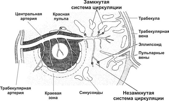Рис. 11-21. Кровоток в селезёнке. Трабекулярные артерии ® пульпарные артерии ® артериолы и капилляры фолликула ® синусы краевой зоны ® выход Т- и B–лимфоцитов из сосудистого русла. Артериолы фолликула ® кисточковые артериолы красной пульпы ® капилляры-синусоиды. [17]