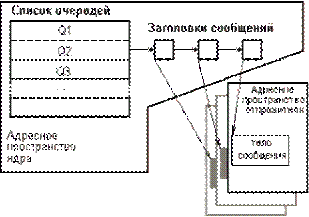 Черги утілюють модель взаємодії процесів "багато відправників - один одержувач". Цю модель часто називають поштовою скринькою (mailbox) із-за схожості з поштовою скринькою, що висить на дверях кожної квартири. Процес-одержувач є власником черги, він створює чергу, а решта процесів дістає до неї доступ, "відкриваючи" її. Черга зазвичай має зовнішнє ім'я. Передача даних в черзі відбувається завжди повідомленнями, причому кожне повідомлення має заголовок і тіло. Заголовок завжди має фіксований для даної системи формат. У нього обов'язково входить довжина повідомлення, а інша інформація залежить від специфікацій конкретної системи: це може бути пріоритет повідомлення, тип повідомлення, ідентифікатор процесу, що послав повідомлення і тому подібне Тіло повідомлення інтерпретується по правилах, що встановлюються самими процесами - відправником і одержувачем. Заголовок і тіло є істотно різними структурами даних і розташовуються в різних місцях в пам'яті. Власне черга (найчастіше - лінійний список) ОС складає із заголовків повідомлень. У елементи черги включаються покажчики на тіла повідомлень, розташовані в пам'яті системи або процесів. Як правило, можливості процесу-одержувача повідомлень не обмежуються читанням по дисципліні FIFO, йому надається багатший вибір дисциплін: LIFO, по пріоритету, по типах, по ідентифікаторах відправника і тому подібне У розпорядженні власника є також засоби визначення розміру черги, а можливо, і проглядання черги - неруйнуючого читання з неї. У розпорядженні процесу-відправника є тільки виклик типу sendMessage - посилки повідомлення в чергу. Якщо при спробі процесу послати повідомлення виявляється, що черга заповнена, процес-відправник блокується. Це, втім, досить окремий випадок, оскільки системні обмеження на розмір черг ніколи не бувають дуже жорсткими. Процес-одержувач блокується при спробі читати повідомлення, коли черга порожня. Істотним питанням при конструюванні механізму черг є питання про включення або невімкнення в ОС системної буферизації повідомлень. При включенні такого засобу (рис.9.2) тіло посиланого повідомлення копіюється в системну область пам'яті, а при читанні - копіюється з неї в адресний простір процесу-одержувача. За відсутності системної буферизації тіла повідомлень зберігаються в загальній для відправника і одержувача пам'яті, а передається тільки покажчик на тіло повідомлення (рис.9.3). У першому випадку виконуються додаткові пересилки, витрачається додаткова пам'ять і вводяться жорсткіші обмеження на об'єм повідомлень, але досягається надійність передачі і значно більш простій інтерфейс процесів. У другому випадку значно економиться пам'ять, але самі процеси повинні піклуватися про управління спільно використовуваною пам'яттю і про збереження повідомлень в ній. За відсутності системної буферизації повідомлень застосовуються зазвичай два методи передачі тіла повідомлення: або процес-відправник поміщає тіло повідомлення в окремий сегмент, що розділяється, отримує у ОС маніпулятор цього сегменту для процесу-одержувача і передає цей маніпулятор у складі повідомлення; або для всіх повідомлень виділяється одна загальна область пам'яті із загальним маніпулятором, і для розміщення повідомлення в нім використовуються системні виклики виділення пам'яті в купі.