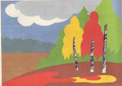 Сюжет — это определенное событие, ситуация, явление, изображенное в произведении. Как отбирать сюжеты для аппликации? Историческое прошлое страны, города, памятники старины, архитектуры могут служить темами сюжетной аппликации. Много интересных тем для композиции подскажут современная жизнь. Обширный материал для сюжетной аппликации представляет художественная литература. Требования к подбору художественных произведений определяются возможностью передачи их содержания в аппликации. Отражая в работе главные события, описанные в произведении, надо стремиться к точной передаче сюжета художественного текста, взятого в основу аппликации. Темами для сюжетной аппликации могут служить изображения на открытках, в журналах, книгах. В таких работах в основном совершенствуется технология выполнения аппликации, но ограничены возможности развития творчества, фантазии. Так же как и в других видах аппликации, в сюжетной самый разнообразный материал дают зарисовки с натуры. Накапливать их надо постоянно, чтобы в дальнейшем использовать при составлении композиций. Сюжетные аппликации могут быть несложными по содержанию, композиции и сложными, динамичными по действию, с большим количеством персонажей, предметов, деталей. Если сюжет несложный, изображение вырезают без предварительной разметки. Так выполняют сюжетную аппликацию (рис.4)