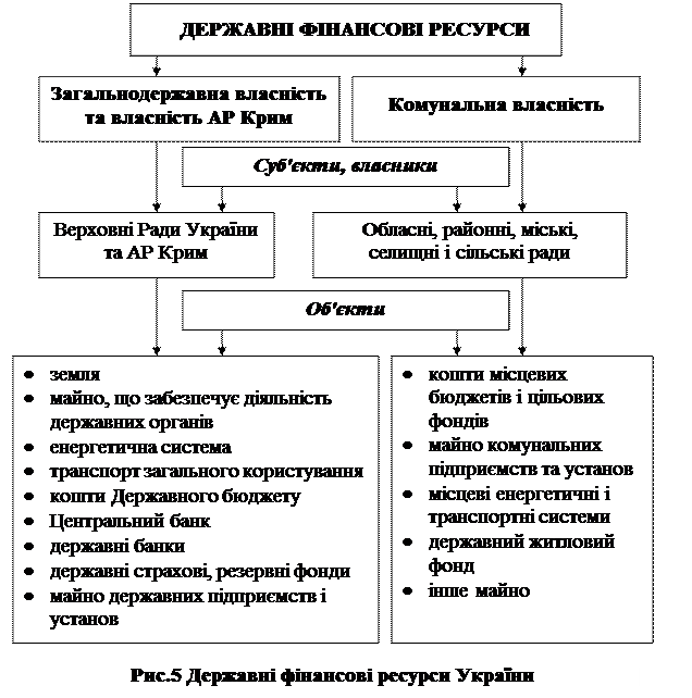 Державні фінанси – система грошових фондів, зосереджених у руках держави і призначених для виконання властивих їй функцій, а також сукупність форм і методів, за допомогою яких ці функції реалізуються. До державних фінансів мобілізуються значні обсяги ресурсів. Наприклад, в Україні частка ВВП, яка розподіляється за участю держави, складає 40%. Державні фінанси складають основу суверинитету України і забезпечують її економічний і соціальний розвиток. Державні фінанси розглядаються як: • центральна підсистема фінансової системи країни, через яку здійснюється вплив держави на економічний та соціальний розвиток країни; • сукупність економічних відносин, пов’язаних з первинним та вторинним розподілом ВВП з метою утворення грошових фондів, необхідних для виконання державою, властивих їй функцій; • сукупність фінансових інститутів, за допомогою яких держава здійснює свою фінансову діяльність. Складові державних фінансів україни: Зведений бюджет України – сукупність показників бюджетів, що використовуються для аналізу і прогнозування економічного і соціального розвитку держави. Він включає державний бюджет України, зведений бюджет Автономної Республіки (АР) Крим, зведені бюджети областей і міст Києва та Севастополя. Фінанси державних підприємств характеризують систему економічних відносин щодо формування, розподілу і використання фінансових ресурсів на підприємствах з державним капіталом для забезпечення ефективного розвитку їх на всіх стадіях життєвого циклу. Державні цільові фонди – це сукупність фондів грошових коштів, які знаходяться у розпорядженні центральних і місцевих органів влади і використовуються на певні цілі, що мають першорядне значення для країни. Державний кредит – це сукупність кредитних відносин, в яких позичальником виступає держава (в особі Міністерства фінансів, республіканських і місцевих органів влади), а кредиторами – юридичні або фізичні особи. Державний кредит здійснюється з метою мобілізації додаткових грошових ресурсів для покриття бюджетного дефіциту без проведення грошової емісії. Державні фінанси України формуються із фінансових ресурсів, що знаходяться в загальнодержавній, АР Крим і комунальній власності. Склад фінансових ресурсів держави показаний на рисунку 5.