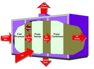 Fuel cells system But, of course, unit fuel cell or even stack of fuel cells is not enough for building up power system. In addition to the stack, practical fuel cell systems require several other sub-systems and components (see figure 3); the so-called balance of plant (BoP). Together with the stack, the BoP forms the fuel cell system[2]: Fuel preparation. Except when pure fuels (such as pure hydrogen) are used, some fuel preparation is required. [2] Air supply. This includes air compressors or blowers as well as air filters. [2] Thermal management. All fuel cell systems require careful management of the fuel cell stack temperature. [2] Water management. Water is needed in some parts of the fuel cell, while overall water is a reaction product. To avoid having to feed water in addition to fuel, and to ensure smooth operation, water management systems are required in most fuel cell systems. [2] Electric power conditioning equipment. Since fuel cell stacks provide a variable DC voltage output that is typically not directly usable for the load, electric power conditioning is typically required. [2]