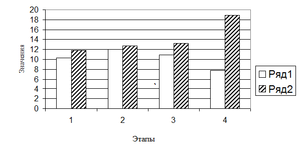 Рис. 3. Выраженность эмоции печали у музыкантов-инструменталистов (мужчин и женщин) в процессе становления профессионального мастерства Примечание: 1) 1 ряд - мужчины, 2 ряд – женщины; 2) Этапы: 1 – школьники, 2 – учащиеся училища, 3 – студенты консерватории, 4 – музыканты профессионального коллектива.