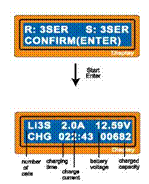Левая сторона верхней строки показывает тип батареи, Вы выбрали. Значение слевао во второй строке устанавливает ток зарядки и его значение справа.. После установки тока и напряжения требуется давить Start/Enter больше 3 секунд, чтобы запустить процесс. (ток заряда: 0.1~5.0A, Напр.: 1~6 элемент)