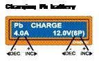 Pb(lead-sulphuric acid) программа батарей Эта программа для Pb батарей. с номинальным напряжением от 2 до 20V. батареи Pb отличаются от NiCd или батарей NiMH. Они подвержены саморазряду, ток сравниваются с их ёмкостью, и подобные ограничения определенно применяются к зарядке. Таким образом оптимальный ток зарядки будет 1/10 ёмкости. Батареи Pb нельзя питать быстро. Всегда следуйте, инструкции завода - изготовителя батареи. Когда Вы желаете изменить значение параметра в программе,-жмите ключ Start/Enter, чтобы заставить это мигнуть,после изменяйте значение ключом DEC или INC. Значение будет сохранено, прессуя ключ Start/Enter один раз. Заряд Pb батарей.