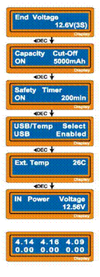Дополнительная информация в процессе работы Вы можете получить дополнительную информацию относительно экрана LCD во время зарядного или разрядного процесса. Когда Вы прессуете кнопку DEC, зарядное устройство показывает значение установок пользователя. Также Вы можете контролировать напряжение индивидуальной ячейки, прессуя кнопку INC, когда индивидуальный соединительный кабель связан с обрабатываемой батареей Lithium.