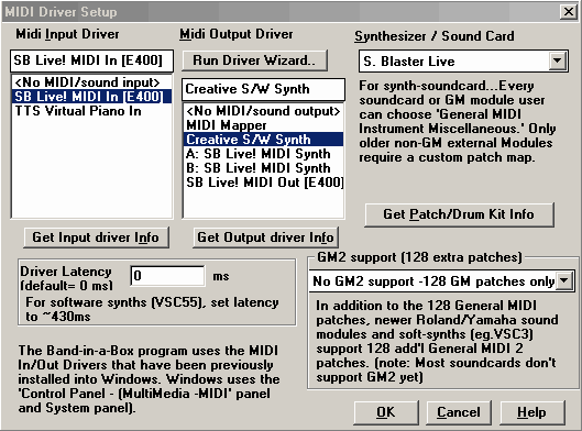 Программа-автоаккомпаниатор (или, как ее часто называют, автоаранжировщик) Band-in-a-Box давно вышла в лидеры этой группы музыкального программного обеспечения благодаря удобному интерфейсу, разнообразию и качеству стилей, широкому спектру возможностей по созданию собственной музыкальной стилистики и многим другим полезным качествам. Основной принцип работы с программой таков: пользователь вводит гармоническую структуру произведения (последовательность аккордов), выбирает стиль, и Band-in-a-Box автоматически создает MIDI-аккомпанемент. Впервые программа увидела свет в 1991 году (в версии для компьютеров Atari), тогда она позволяла создавать аккомпанемент из трех партий, вводить текст, а также была совместима со стандартными MIDI-файлами. В процессе дальнейшего развития программа была выпущена для Windows и MacOS, количество партий аккомпанемента увеличено до пяти, были добавлены совместимость с General MIDI (а в дальнейшем также с GS и XG), трек мелодии, возможность редактировать и печатать материал в нотном виде, создавать собственные стили, функция автоматической гармонизации. В версии 7 появились функции сольной импровизации (с возможностью создания собственных солистов) и гуманизации мелодии, в версии 8 — функции автоматического генерирования мелодий, автоматического создания вступлений и названий произведений, гитарные гриф и тюнер, анимированная ударная установка. Основным нововведением версии 9 была поддержка аудиофайлов (запись, редактирование, сохранение), также были добавлены возможность создания аккордового гитарного соло и собственных клавиатурных сокращений для ввода аккордов. В версии 10 появились стили гитарного аккомпанемента, функции замены аккордов и тренировки музыкального слуха, поддержка подключаемых модулей формата DirectX для обработки аудио, возможность прожигания аудио-CD. Версия 11 добавила автоматическое определение аккордов при импортировании MIDI-файла, показ нот нескольких треков одновременно, рендеринг в аудиофайл (при помощи прилагаемого программного синтезатора Roland VSC 3), вариации при проигрывании мелодии. Версия 12 позволяет производить автоматическое преобразование MIDI-файла в стиль и поддерживает General MIDI 2. Минимальными системными требованиями Band-in-a-Box версии 12 являются: Windows 95/98/ME/NT/XP, процессор 486DX и выше, 16 Мб оперативной памяти (рекомендуются 32 Мб), 135 Мб свободного места на диске, Windows-совместимая звуковая плата или MIDI-интерфейс с внешним MIDI-оборудованием. Как видим, требования вполне умеренны. Во время инсталляции программы производится выбор подходящих MIDI-драйверов для записи и воспроизведения. В дальнейшем можно поменять драйверы, выбрав в меню Opt. (Options) пункт MIDI Driver Setup. В появившемся окне (рис. 1) можно воспользоваться кнопкой Run Driver Wizard — вариантам будут даны разъяснения, а рекомендованный драйвер будет выделен тремя звездочками. Если используемый вами тон-генератор несовместим с General MIDI, то в меню Synthesizer/Sound Card можно выбрать соответствующую ему карту ударных инструментов и пэтчей.