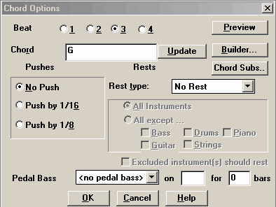 Появится диалоговое окно Chord Options (рис. 5). Функции этого окна несколько шире (Pedal Bass, например, служит для того, чтобы провести басовую партию на нужной ноте определенное количество тактов при смене аккордов, а Rest Type позволяет оставлять только нужные нам инструменты на определенном отрезке времени). Мы же ограничимся только необходимой в данном случае корректурой самого аккорда — заменим Gaug аккордом G.