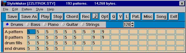 Вернувшись в окно StyleMaker, создадим паттерны ударных. В принципе, можно было бы импортировать их из стиля BlueHill.sty, но лучше сделаем все с нуля. Убедимся, что в окне StyleMaker выбрана партия ударных, у которой выделен первый паттерн субстиля A. Нажмем кнопку Rec или клавишу F3.