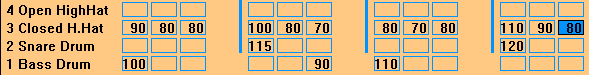 Сделанные настройки означают, что в данном паттерне обычный закрытый хет используется в 50 процентах случаев, а в других 50 процентах будет использоваться открытый хет (инструмент номер 4) с динамикой 90. Это удобная функция, позволяющая разнообразить звучание. После установки альтернативной ноты данная доля будет окаймлена красным.