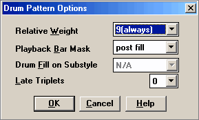 Теперь проиграем полученный паттерн, и если он звучит так, как нужно, нажмем кнопку Exit (или клавишу F10) для завершения редактирования. При этом откроется окно Drum Pattern Options (рис. 15), в котором можно установить опции паттерна. Нажмем OK, согласившись со значениями, установленными по умолчанию: средняя частота использования (вес 5) и любой такт (0 в параметре Playback Bar Mask).