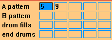 Как мы помним, в программе при делении произведения на части (куплетно-припевная форма) есть возможность использовать субстили A и B. Таким образом, A pattern — это строка паттернов ударных для субстиля A, а B pattern — то же для субстиля B. Drum fills — строка паттернов брейков, а End drums — паттерны ударных, характерные для окончания произведения в этом стиле. Рассмотрим строку с паттернами субстиля A.