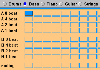 Выберем партию баса в окне StyleMaker (рис. 19). Здесь мы видим пустые пока строки паттернов субстилей A и B разной продолжительности (от двух тактов — 8 beat, до одной четверти — 1 beat), а также двухтактовой коды (ending).