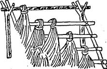 Шалаши из травы Построение шалашей Пучковые-травяные крыши одни из лучших по водонепроницаемости и по простоте сооружения. Пучковую крышу можно изготовить, только если имеется достаточное количество травы, длина которой не менее 60—90 см (чем длиннее, тем лучше). Сделав каркас крыши, срезанную траву берут небольшими пучками и корневыми концами обертывают один раз вокруг перекладины и травою же привязывают. Пучки укладываются вдоль перекладины, и просветы между ними закрываются рядом пучков, уложенных на верхней перекладине. Укладка начинается от земли, нужно обращать внимание на то, чтобы верхний ряд пучков покрывал нижний не менее чем на три четверти. Если трава недостаточно длинна для этого, каркас крыши, т. е. перекладины, нужно вязать плотнее. Необходимо помнить, что пологая крыша не так хороша, как крутая, обеспечивающая естественный скат воды.