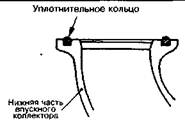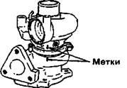 Снятие Корпус турбонаддува ТУРБОНАДДУВ Уплотнительное кольцо При установке верхней части впускного коллектора обязательно следует вставить новые четыре уп-лотнительных кольца на нижнюю часть впускного коллектора (см.рис. ЗБ.11). 1. Перед снятием необходимо нанести метки на соответствующие места (показаны на рис.ЗБ.13.) корпуса турбины, крышки компрессора и турбинного колеса, чтобы обеспечить правильную их установку. Внимание! При снятии следить за тем, чтобы рабочее колесо компрессора и турбинное колесо не были повреждены. 2. Корпус турбины проверяется на отсутствие следов соприкосновения с турбинным колесом, а также вызванных перегревом трещин, вмятин, деформаций и других повреждений (см. рис.ЗБ.14). Если обнаруживаются трещины, корпус турбины необходимо заменить новым. 3. Рычаг исполнительного привода клапана рециркуляции отработавших газов приводится в действие рукой для того, чтобы проверить его четкое открывание и закрывание. ЗБ. Дизельный двигатель 4D65 1.8 л 1988-1993 гг.