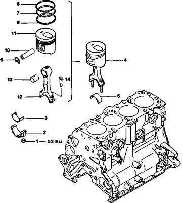 Рис.ЗБ.63. Шатунно-поршневая группа: 1. Гайка, 2. Крышка шатуна, 3. Нижний вкладыш шатунного подшипника, 4. Поршень и шатун (в сборке), 5. Верхний вкладыш шатунного подшипника, 6. Верхнее компрессионное кольцо, 7. Нижнее компрессионное кольцо, 8. Маслосъемное кольцо, 9. Стопорное кольцо поршневого пальца, 10. Поршневой палец, 11. Поршень, 12. Шатун, 13. Втулка, 14. Болт крышки шатуна.