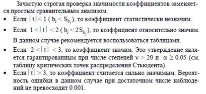 Что такое статистическая значимость коэффициентов регрессии, как ее определить? После построения уравнения регрессии необходимо сделать проверку его значимости: с помощью специальных критериев установить, не является ли полученная зависимость, выраженная уравнением регрессии, случайной, т.е. можно ли ее использовать в прогнозных целях и для факторного анализа. В статистике разработаны методики строгой проверки значимости коэффициентов регрессии с помощью дисперсионного анализа и расчета специальных критериев. Статистическая значимость коэффициентов множественной линейной регресии с m обьясняющими переменными проверяется на основе t-статистики: Наблюдаемое значение t-статістікі сравнивается с критической точкой распределения Стьюдента.Если |t|>этого коэффиц. Стьюдента,то коэфф. считается статистически значимым,в обратном случае коэффициент считается статистически незначимым(близким к 0).