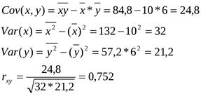 rxy – безразмерная величина, показывает степень линейной зависимости между переменными. Чем ближе rxy к ±1, тем сильнее линейная зависимость. Чем ближе rxy к 0, тем линейная зависимость слабее. Если rxy = ±1, то имеет место функциональная линейная зависимость. Если rxy = 0, то линейная зависимость отсутствует. Если rxy >0, то связь между переменными положительная, если rxy <0 – отрицательная.