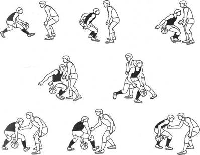 Ведение мяча - прием (классификация ведения мяча представлена на рис.10), дающий возможность игроку двигаться с мячом по площадке с большим диапазоном скоростей и в любом направлении. Ведение позволяет уйти от плотно опекающего защитника, выйти с мячом из-под щита после успешной борьбы за отскок и организовать стремительную контратаку. С помощью ведения можно поставить заслон партнеру или, наконец, отвлечь на время соперника, опекающего партнера, чтобы затем передать ему мяч для атаки. Во всех остальных случаях злоупотреблять ведением не следует, чтобы не снижать быстроту контратак и не нарушать ритма игры. Ведение осуществляется последовательными мягкими толчками мяча одной рукой (или поочередно правой и левой) вниз-вперед несколько в сторону от ступней. Основные движения выполняют локтевой и лучезапястный суставы. Ноги необходимо сгибать, чтобы сохранять положение равновесия и быстро изменять направления движения. Туловище слегка подают вперед; плечо и рука, свободная от мяча, должны не допускать соперника к мячу (но не отталкивать его!). Для ведения характерна синхронность чередования шагов и движений руки, контратакующей с мячом. Игрок, продвигаясь таким образом, должен в то же время следить за расположением партнеров и соперников и ориентироваться на щит. Целесообразно периодически переключать зрительный контроль с мяча на поле и обратно (рис. 11). Баскетболист при ведении обязан одинаково хорошо владеть правой и левой рукой. Обводка с изменением скорости. К неожиданным изменениям скорости ведения мяча прибегают для того, чтобы оторваться от защитника. Скорость ведения зависит прежде всего от высоты отскока мяча от площадки и угла, под которым он направляется к площадке. Чем выше отскок и меньше его угол (в рациональных пределах), тем больше скорость продвижения. При отскоке, низком и близком к вертикальному, ведение замедляется и может вообще выполняться на месте. Обводка с изменением направления. Ее используют главным образом для обводки соперника и проходов для атаки кольца. Изменяют направление таким образом: кисть накладывают на различные точки боковой поверхности мяча и выпрямляют руку в нужном направлении. Используют также обводку с изменением высоты отскока и с поворотами и переводами мяча. Широко используется также способ обводки соперника с переводом мяча с одной руки на другую, скрытно, за спиной или под ногой (рис 12).