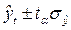 Проверим тренд в нашей задаче на адекватность по формуле (59), для чего в 7-м столбце таблицы 6 рассчитан числитель остаточной дисперсии, а в 8-м столбце – числитель аналитической дисперсии. В формуле (59) можно использовать их числители, так как оба они делятся на число уровней n (n сократятся): FР = 53327,348*8/(16476,25*1) = 25,893 > FТ, значит, модель адекватна и ее можно использовать для прогнозирования (FТ = 5,32 находим по приложению 1 в 1-ом столбце [ При составлении прогнозов уровней социально-экономических явлений обычно оперируют не точечной, а интервальной оценкой, рассчитывая так называемые доверительные интервалы прогноза. Границы интервалов определяются по формуле (63):