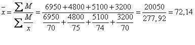 Осредняемый признак — заработная плата на одного работающего. Расчет осуществляется по следующей логической формуле: Заработная плата на 1 работающего = (Фонд оплаты труда (ФОТ)) / (Численность работающих). Поскольку мы считаем среднюю заработную плату по всем предприятиям, расчет средней заработной платы будет произведен по следующей формуле: Средняя заработная плата = (Общий фонд оплаты труда по всем предприятиям) / (Общая численность работающих на всех предприятиях). В исходной формуле числитель (общий ФОТ) может быть найден следующим образом: Общий ФОТ по всем предприятиям = (ФОТ в среднем на одно предприятие) ´ (Число предприятий в группе). При расчете знаменателя (численность работающих) используем данные предыдущего расчета: Численность работающих = (Общий ФОТ по всем предприятиям) / (Заработная плата на одного работающего). Расчет средней осуществляется по формуле средней гармонической взвешенной. При расчете учитываем, что значения признака представлены в виде интервалов, поэтому необходимо установить центры интервалов. Берем полусумму каждого интервала (его центр), считая, что этот центр является средней, характеризующей всю совокупность величин, находящихся в данном интервале. В расчете будут использованы середины интервалов: