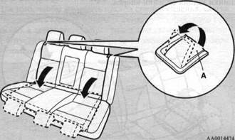 Потяните кнопку (А) в сторону центра салона и сложите спинки задних сидений вперед. ПРИМЕЧАНИЕ • Шторку багажного отделения можно хранить в напольном ящике багажного отделения (когда шторка не используется). Более подробная информация содержится в параграфе "Шторка багажного отделения" на стр. 5-40.