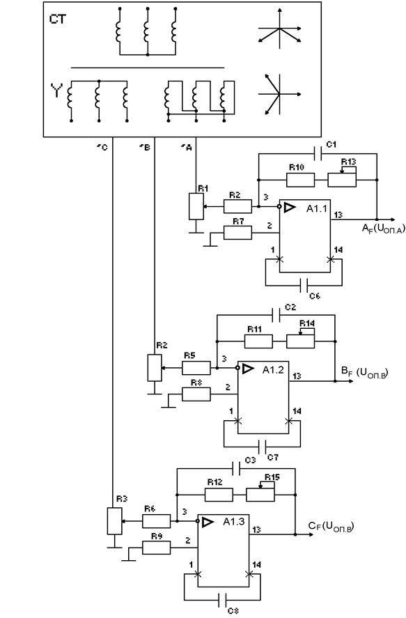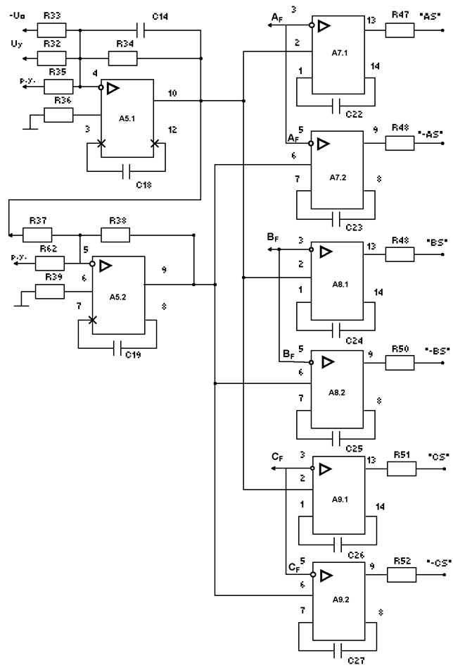 Рис. 3.5. Узел фазосмещения. Как следует из функциональной схемы рис. 3.3. СИФУ состоит из узла формирования опорных напряжений Z, узла фазосмещения АТ и переключающего устройства АВ. Узел формирования опорных напряжений (рис.3.4.) включает в себя синхронизирующий трехфазный трансформатор с двумя группами вторичных обмоток (СТ), которые можно включать по схемам звезды или треугольника, и ячейку фильтра Z с тремя каналами апериодических фильтров, обеспечивающих фазовый сдвиг на 60о (240о при учете инвертирования напряжений операционными усилителями). Амплитуда опорных напряжений после фильтра Узел фазосмещения АТ (рис. 3.5.) формирует шесть последовательностей импульсов для выпрямительного моста VSF (“В”) или для моста VSB (“Н”), которые усиливаются усилителями A-F, A-B. Узел фазосмещения состоит из шести компараторов А7.1, А7.2, А8.1, А8.2, А9.1, А9.2 на входе которых сравниваются напряжения управления На один из входов усилителя А5.1, имеющего коэффициент передачи равный 1, поступает сигнал управления Uу из системы автоматического регулирования, а на второй вход – напряжение начального согласования Uо, обеспечивающее начальный угол управления при Сравнение По переходу сигналов на выходе компараторов А7.2, А8.2, А9.2 из “1” в “0” – формируются импульсы группы “назад”. После логической обработки также получают шесть 180–градусных сигналов, по фронту и спаду которых формируются импульсы катодной и анодной группы тиристоров “назад”. Выбор работающего моста осуществляется логическим переключающим устройством АВ в зависимости от полярности напряжения переключения Uп и абсолютного значения тока нагрузки Измерение тока производится трансформаторами переменного тока, установленных в фазах силового трансформатора, или датчиками постоянного тока, подключенными к шунту в цепи нагрузки. Оба этих датчика не могут обеспечить достаточно высокую чувствительность измерения тока и поэтому являются «грубыми» датчиками. Для получения быстродействующей системы реверса тока наличие «грубого» датчика необходимо, так как по его команде производится срыв импульсов, что ускоряет спадание тока в выходящей из работы группе. Кроме измерения тока силовой цепи в преобразователе производится контроль состояния силовых тиристоров с помощью блока датчика состояния тиристоров, который непосредственно фиксирует моменты запертого состояния всех тиристоров силового моста. По команде этого датчика начинается отсчет бестоковой паузы (1-2 мс), которая может быть рассчитана на время, необходимое для восстановления запирающих свойств тиристоров. В работе схемы АВ принимает участие один из «грубых» датчиков и «тонкий» датчик. Защита осуществляется узлом АF, который воспринимает нагрузку в цепи переменного тока Расчет фазовых характеристик СИФУ реверсивного тиристорного преобразователя с синусоидальным опорным напряжением производится по формуле