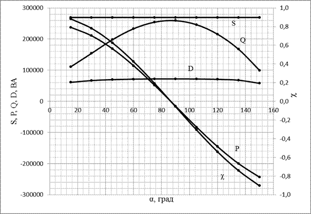 - угол регулирования α в расчётах принимается от αmin = 15˚ до αmax = 180˚. 6. Полная мощность