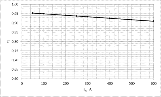 Таблица 3.6. – Зависимость η=f (α) при Id =404,04 A, I1ф = 329,83 А.