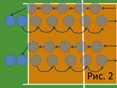 «Передачи в движении». Игроки в двух колоннах по одному выстраиваются за лицевой линией. Первые игроки в колоннах по сигналу тренера перемещаются к сетке, выполняя передачи мяча двумя руками сверху над собой. Дойдя до сетки, бросают в нее мяч и принимают его снизу двумя руками. Возвращаясь к своей колонне, игроки выполняют передачи двумя руками снизу. Затем то же делают вторые игроки и т.д. (рис. 2). За каждое падение мяча на пол команде засчитывается штрафное очко. Победившей считается команда, набравшая меньше штрафных очков. «Спираль». Игроки располагаются в двух колоннах в затылок друг другу. Первые игроки в колоннах держат в руках по мячу. По свистку первый передает мяч верхней передачей за голову второму и поворачивается кругом, второй делает то же и т.д. Когда мяч доходит до последнего в колонне, он одну передачу делает над собой, поворачивается кругом и передает мяч за голову предпоследнему и т.д. Выигравшей считается команда, у которой игрок, начавший упражнение, получил мяч первым.
