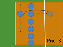 «Передал — выйди». Игроки в парах на расстоянии 4 м друг от друга из-за лицевой линии начинают передачи мяча двумя руками сверху (снизу) в движении, перемещаясь боком к противоположной линии и обратно. Побеждает та пара, которая допустила меньше потерь мяча (рис. 1). «Мяч партнеру». 6—8 игроков стоят по кругу и один в центре круга. По сигналу игроки, стоящие по кругу, передают мяч друг другу, а тот, который стоит в центре, пытается коснуться мяча. Мячи передают в различных направлениях. Центральный игрок, коснувшись мяча, становится в круг на место того, чью передачу он перехватил, а игрок из круга — на место центрального, и игра продолжается.