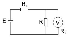 Из данного выражения следует, что погрешность измерения тем меньше, чем меньше мощность потребления амперметра РА по сравнению с мощностью потребления амперметра Р цепи. Поэтому амперметр, включаемый последовательно в цепь нагрузки, должен обладать малым сопротивлением, т.е. Задача 3.6 Определить относительную методическую погрешность измерения напряжения вольтметром c внутренним сопротивлением RV на нагрузке R в цепи с источником энергии, ЭДС которого Е и внутреннее сопротивление R0. Вольтметр включен параллельно нагрузке.