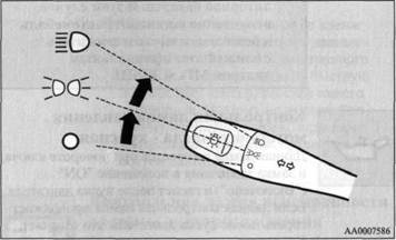 • На автомобилях, оборудованных системой дистанционного управления замками дверей, контрольная лампа незакрытой двери горит в течение определенного времени, а затем автоматически гаснет, чтобы предотвратить разряд аккумуляторной батареи. См. параграф "Функция автоматического отключения освещения салона: плафонов верхнего освещения и т.п." на стр. 5-33. Комбинированный переключатель наружного освещения Фары Поворачивайте переключатель, чтобы включать и выключать приборы наружного освещения. ПРИМЕЧАНИЕ • Не оставляйте слишком долго включенными фары • Иногда во время дождя или после того, как автомо Автомобили с функцией включения наружного освещения в светлое время суток Когда ключ зажигания находится в положении "ON" ("Включено"), а комбинированный переключатель наружного освещения находится в положении " о " (OFF - Выключено), то будут включены фары, задние габаритные огни и т.п. Приборы и органы управления Функция автоматического выключения приборов наружного освещения (ближнего света фар, противотуманного фонаря и т.п.) • Если ключ в замке зажигания находится в положении в течение 3 минут. Если в течение этого времени не будет открыта водительская дверь, то приборы наружного освещения выключатся автоматически. • Если ключ в замке зажигания находится в положении из замка зажигания, а переключатель наружного освещения повернут в положение