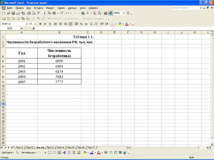 1. Постановка задачи. Статистический анализ безработицы предполагает определение численности безработных, уровня безработицы, а также оценку их динамики. При изучении динамики общественных явлений возникает проблема описания интенсивности изменения и расчета средних показателей динамики. Анализ интенсивности изменения во времени осуществляется с помощью показателей, получаемых в результате сравнения уровней. Для расчета показателей анализа динамики на постоянной базе каждый уровень ряда сравнивается с одним и тем же базисным уровнем. Исчисляемые при этом показатели называются базисными. Для расчета показателей анализа динамики на переменной базе каждый последующий уровень ряда сравнивается с предыдущим. Вычисленные таким образом показатели анализа динамики называются цепными. Важнейшим статистическим показателем анализа ряда динамики является абсолютный прирост (сокращение), т.е. абсолютное изменение, характеризующее увеличение или уменьшение уровня ряда за определенный промежуток времени. Для оценки интенсивности, т.е. относительного изменения уровня динамического ряда за какой-либо период времени исчисляют темпы роста (снижения). Темп прироста (сокращения) показывает, на сколько процентов сравниваемый уровень больше или меньше уровня, принятого за базу сравнения, и вычисляется как отношение абсолютного прироста к абсолютному уровню, принятого за базу сравнения. При анализе динамики развития следует знать, какие абсолютные значения скрываются за темпами роста и прироста. Сравнение абсолютного прироста и темпа прироста за одни и те же периоды времени показывает, что при снижении (замедлении) темпов прироста абсолютный прирост не всегда уменьшается, в отдельных случаях он может возрастать. Поэтому, чтобы правильно оценить значение полученного темпа прироста, его рассматривают в сопоставлении с показателем абсолютного прироста. По данным, представленным в таблице 1.1, необходимо определить: