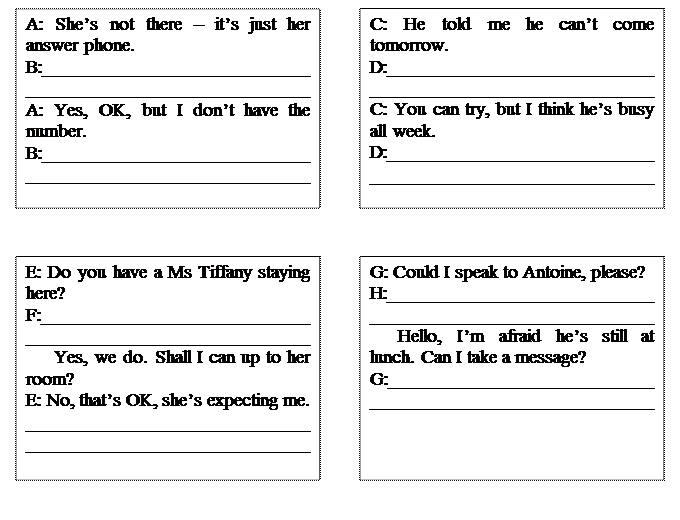 a. Shall I ask him if he's free the day after? b. One moment, please. I'll see if he's there. c. Then we'll have the meeting without him. d. Hold on a moment - I'll look in my address book. e. Shall I try her on her mobile? f. I'll just check the register. g. No, I'll try again a little later. h. I'll wait for her to come down.