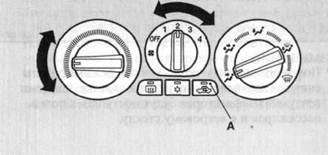 5-16 Для автомобилей с правым расположением рулевого колеса Создание комфортных условий в салоне 1. 2. Установите переключатель выбора режима работы 3. При помощи соответствующего регулятора 4. При помощи регулятора температуры воздуха 5. Нажмите выключатель кондиционера (В), ПРИМЕЧАНИЕ • Для более эффективного удаления запотевания стекол • Не устанавливайте регулятор температуры воздуха В жаркую погоду для поступления в салон наружного воздуха следует установить переключатель (А) в положение поступления наружного воздуха и повернуть регулятор температуры воздуха в положение, показанное на рисунке. Убедитесь, что регулятор температуры воздуха повернут влево до упора. Установите желаемую частоту вращения вентилятора.