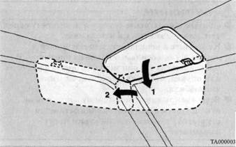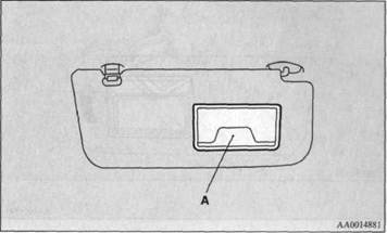 На передней поверхности (А) крышки туалетного зеркала, встроенного в солнцезащитный козырек, имеется держатель. В нем можно хранить документы небольшого формата (талоны, визитные и кредитные карточки и т.п.).