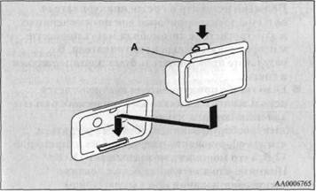 5-25 5-24 Задняя пепельница Чтобы открыть пепельницу, потяните крышку вниз. Чтобы извлечь пепельницу из гнезда, откройте крышку и потяните пепельницу на себя, одновременно нажимая на язычок (А).