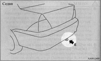 Расположение задней буксирной петли (Е) показано на рисунке. Буксирный трос следует прикрепить к задней буксирной петле.