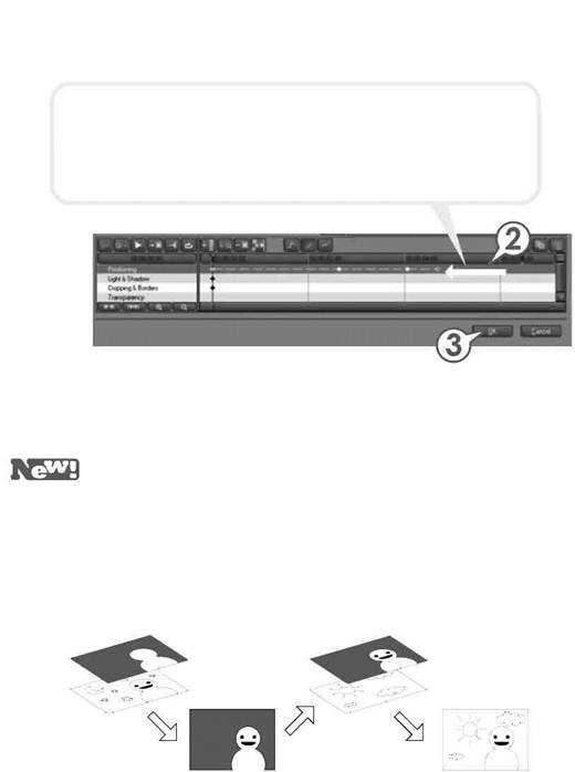 Вы можете синтезировать изображение подобно картине предохранителя, добавляя клип с информацией прозрачности, например клип названия, который имеет прозрачную часть, как алфавитный канал (область данных с информацией прозрачности) другого клипа. Кроме того, Вы можете оверлей синтезируемый на второстепенном изображении