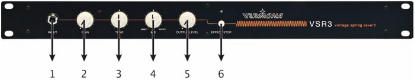 (1) INPUT This high-Z jack input (1MΩ) on the front works well with electric guitars or basses. The inputs on the rear will be muted when this jack is used. (2) GAIN This controller adjusts the input level. For optimal leveling the corresponding LED should only illuminate at high level peaks. (3) TONE The sound of the reverb effect can be influenced with this controller. Low frequencies will be boosted when turning it to the left, on the opposite high frequencies will be boosted when turning it to the right. Center position is 12 o'clock. (4) MIX This controller sets the value between direct and reverberated signal. If the knob is set completely to the left, only the direct signal can be heard. The fare right position means no direct signal but 100% reverberation. (5) OUTPUT LEVEL This controller adjusts the output level. (6) EFFECT STOP This knob turns off the effect signal. It also can be controlled by a foot switch connected to the rear (9). - 5 -