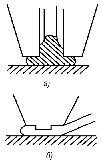 Рис. 1.4. Термокомпресорне формування: інструментом з капіляром (а) і з виступом (б) [3]. Жало має бути виконане з матеріалів, з якими не відбувається схоплювання при зварці: з твердого сплаву ВК-15, кераміки окислу берилія, молібдену. Метод термокомпресії вимагає ретельного контролю основних параметрів процесу: тиску, температури і часу зварки. Міцність зварки оцінюється значеннями контрольного зусилля від 0,3 до 2,5 г, що додається уздовж осі зволікання і ще не викликає відривши. Наприклад, для зволікання діаметром 25 мкм при з'єднанні з товстим зовнішнім виводом типова величина контрольного зусилля складає 0,5 г. Таблиця 1.1 Оптимальні режими термокомпресійного зварювання різних металів