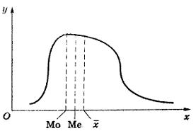 В самом деле, левее и правее медианы размещены одинаковые площади, но левой части соответствует меньшее основание, а правой - большее основание. Поэтому левая часть кривой выше правой, и мода будет находиться левее медианы. По этой самой причине медиана не может служить точкой равновесия, так как площадь части, соответствующей большему основанию, больше площади, размещенной на меньшем основании. Итак, среднее арифметическое находится правее медианы. Таким образом, при правосторонней асимметрии левее расположена мода, далее медиана и правее - среднее арифметическое. Обратное расположение имеет место при левосторонней асимметрии графика. При этом, чем больше асимметричен график, тем больше расстояние между его средними точками. И наоборот.