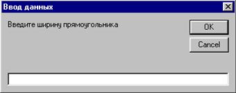 после чего человек вводит в белое текстовое поле этого окна любое число и нажимает ОК. После этого компьютер присваивает переменной a введенное значение и продолжает работу, то есть переходит к выполнению следующего оператора. Запустите проект и посмотрите, как он работает. Если вам не нравится строка Project1 в заголовке окна, то вы можете задать свою строку, так дополнив оператор: a = InputBox("Введите ширину прямоугольника", "Ввод данных") Результат: