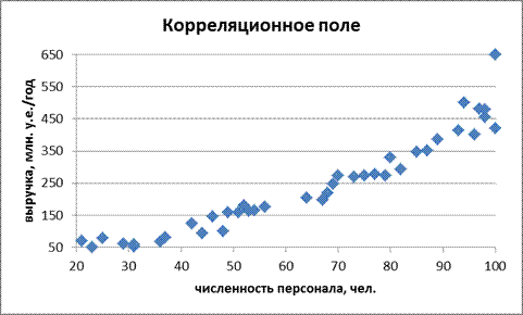 Рис. 3. Корреляционное поле 2. Аналитическая группировка Аналитическая группировка заключается в разбиении качественно однородной совокупности на группы по факторному признаку и подсчете соответственно этим группам среднего значения результативного признака с целью выявления между ними взаимосвязи и определения ее направления. Факторный признак желательно группировать равноинтервально или равнонаполненно. Систематический рост или снижение среднего значения результативного признака в результате возрастания значений факторного свидетельствует о наличии между ними прямой или обратной связи соответственно. Бессистемное изменение среднего значения результирующего признака свидетельствует об отсутствии связи с данным фактором. Таблица 6. Аналитическая группировка